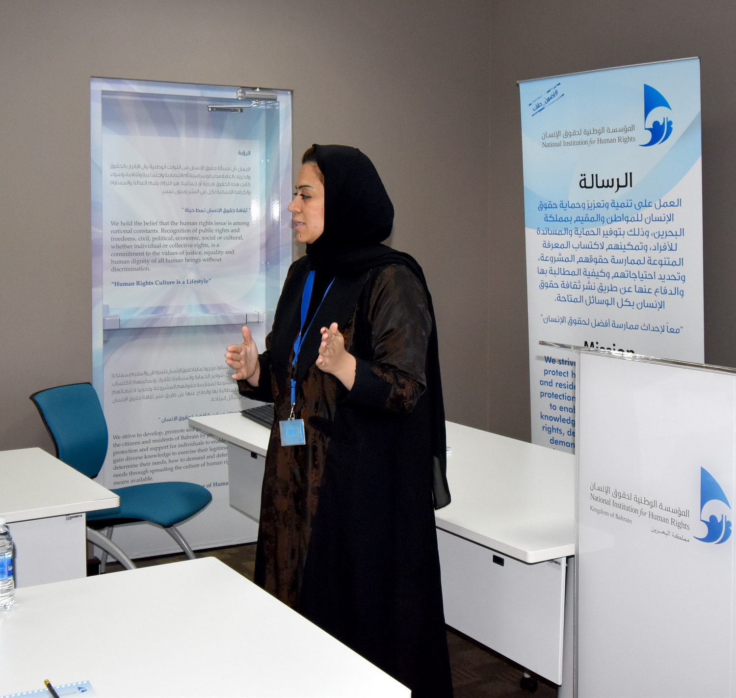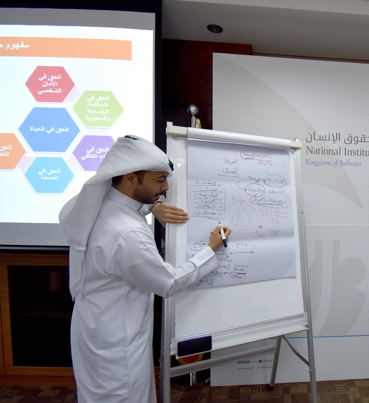 وتضمّنت المحاضرة التعريف بمحاور البرنامج وعرض فيديو تعريفي بالمؤسسة، إلى جانب تقديم محاضرة حول الحقوق والحريات الأساسية في دستور مملكة البحرين.