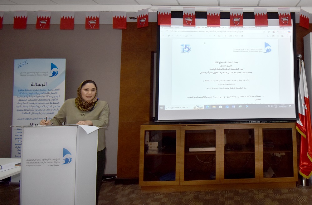 واصل فريق العمل المعني بحقوق المرأة والطفل اجتماعاته الدورية برئاسة الدكتورة مها صالح آل شهاب، مفوض حقوق الطفل، وبمشاركة ممثلي مؤسسات المجتمع المدني ذات الصلة، إلى جانب ممثلي المؤسسة الوطنية لحقوق الإنسان، وذلك بمقر المؤسسة في ضاحية السيف.